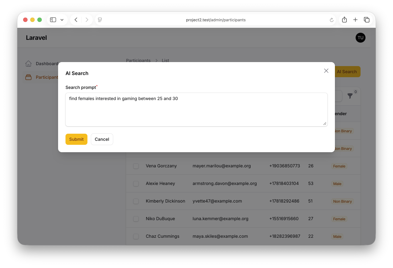 This project demonstrates how to build a natural-language search action for a Filament resource. Instead of exposing a dozen filters and hoping users find them, a single header action accepts a sentence like "Find women interested in technology who are 25-35 and living in London", runs it through a Laravel\Ai agent, and applies the result to the resource table's existing filters — no bespoke query layer, no parallel search pipeline.