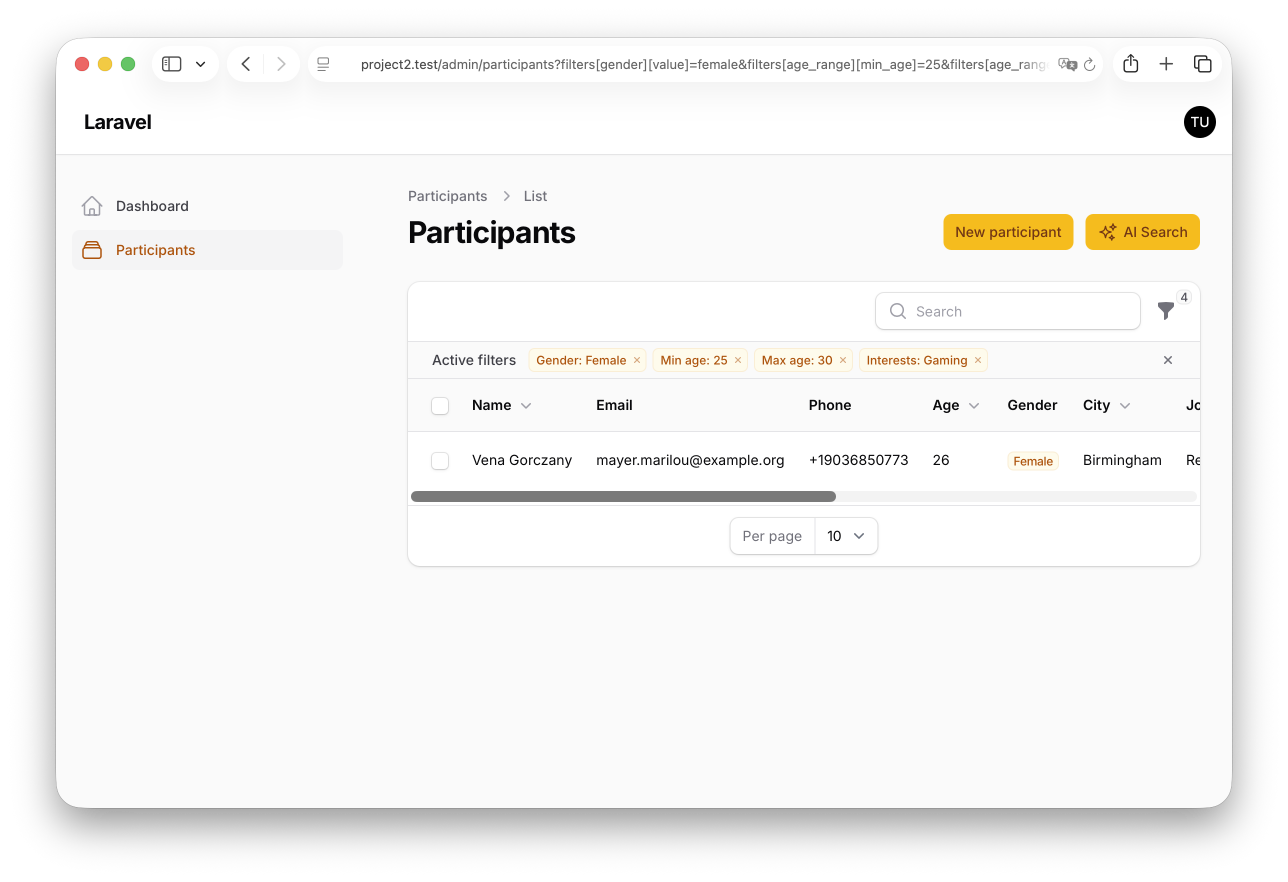 ParticipantSearchAgent — Natural Language to Structured FiltersThe agent implements Laravel\Ai's Agent and HasStructuredOutput contracts, so its output is a typed JSON object instead of free text. The schema keys are named to match the filter keys on the resource table exactly — that one-to-one mapping is what lets the rest of the pipeline stay boring.