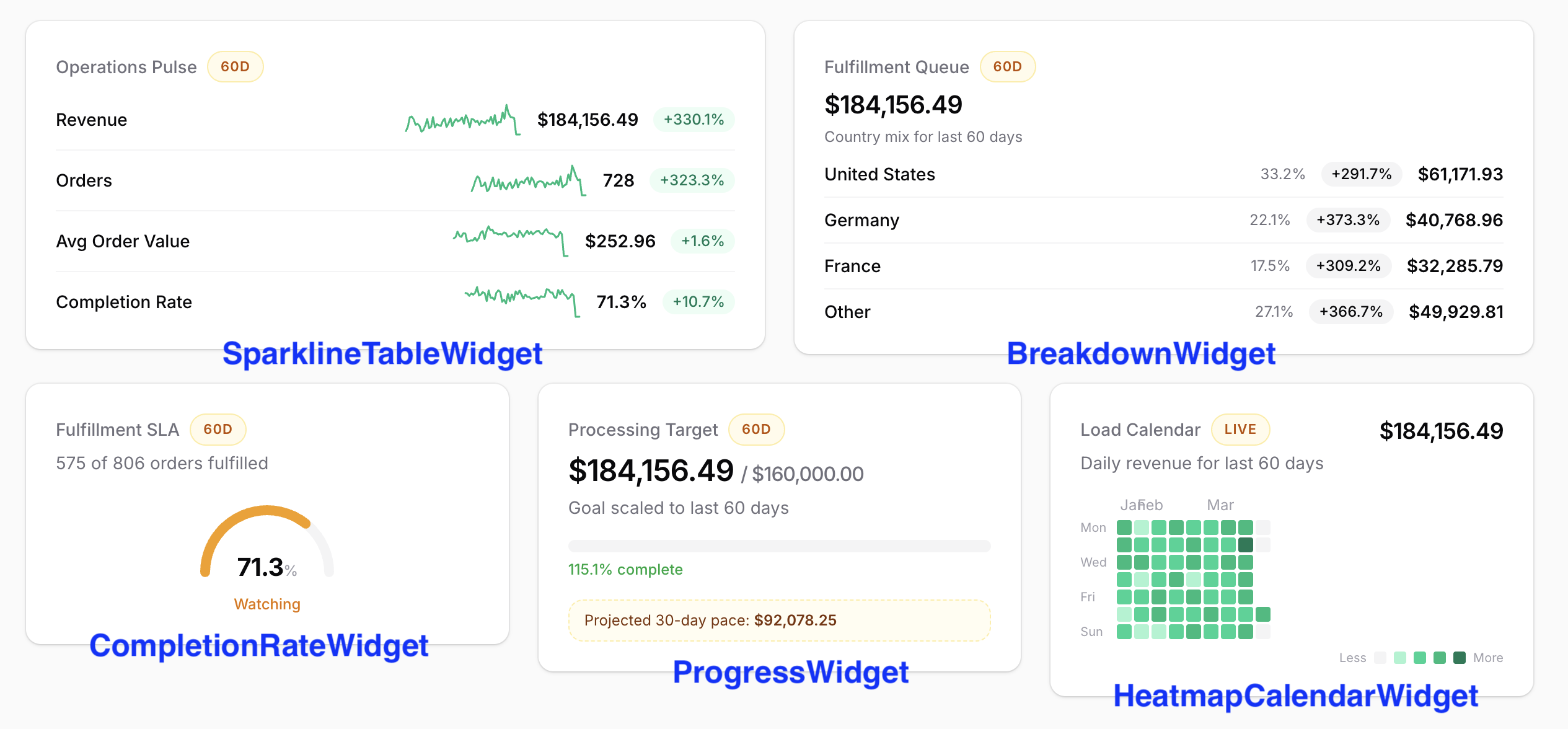 This project uses five widget types from the laraveldaily/filawidgets package — SparklineTableWidget, BreakdownWidget, HeatmapCalendarWidget, ProgressWidget, and CompletionRateWidget — organized into three dashboard presets with shared date-range filtering.