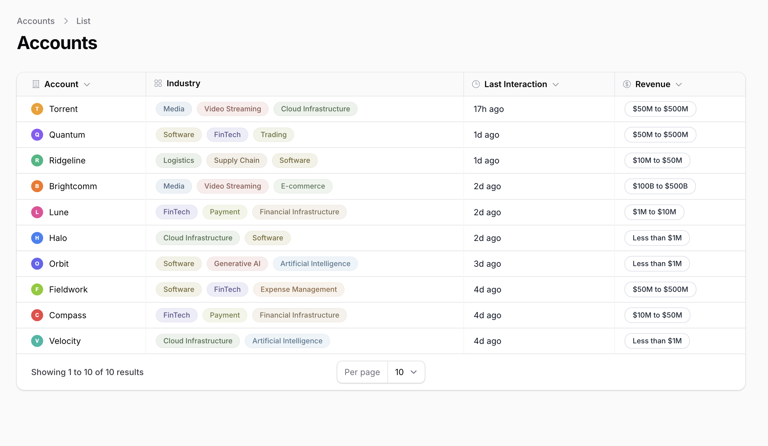 This project demonstrates how to customize the visual design of a Filament table using ViewColumn and custom Blade components. The result transforms a standard admin table into a polished, product-like accounts table with custom industry pills, revenue chips, merged logo+name cells, column dividers, and header icons.