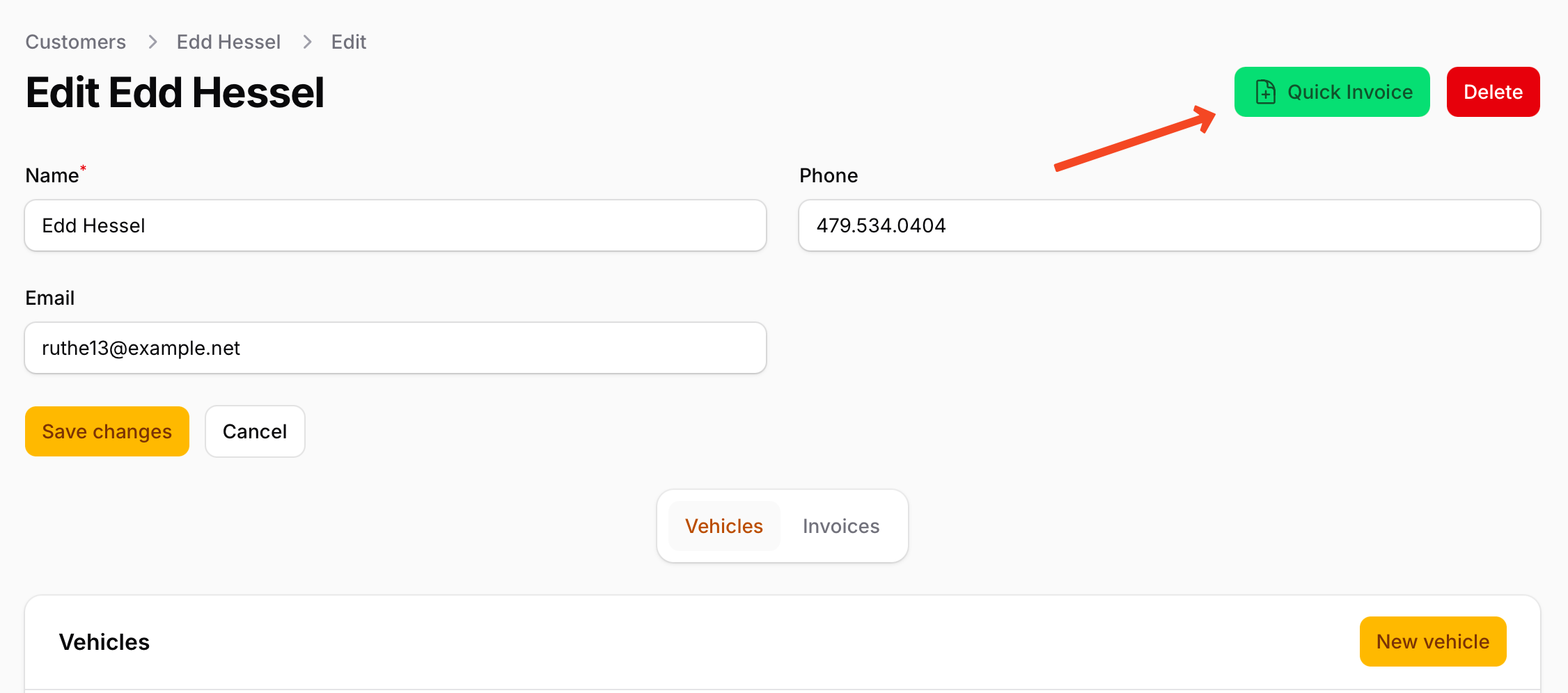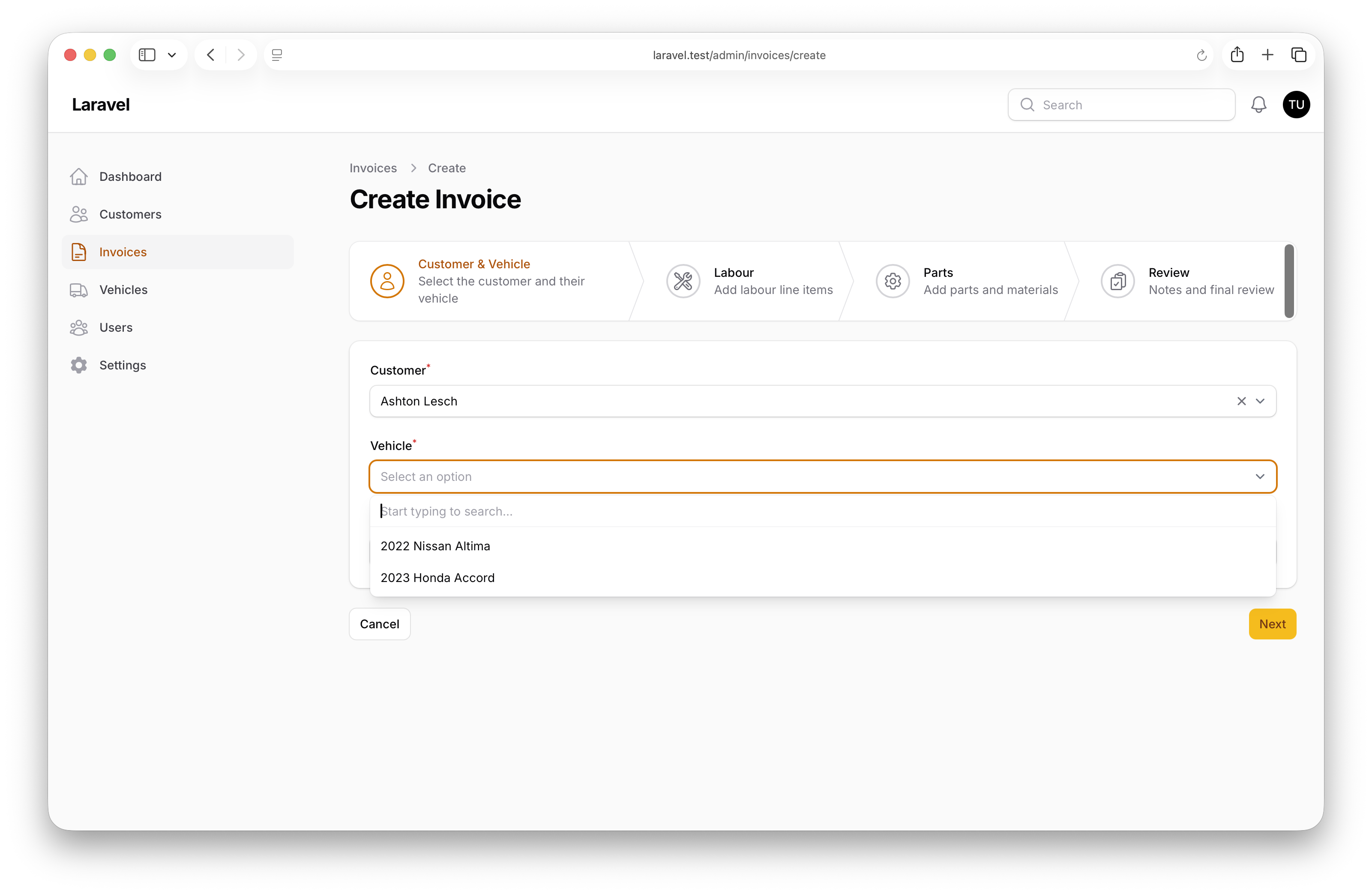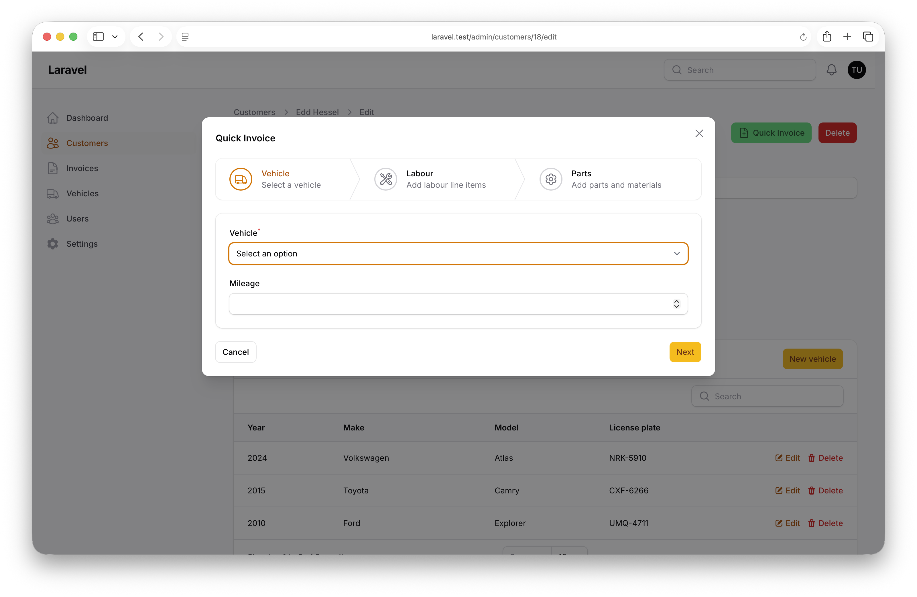 This project demonstrates how to build a multi-step invoice wizard in Filament whose steps are defined once in a central step factory and then reused across two different contexts: the standalone invoice create page and a Quick Invoice action launched directly from the customer edit page. It also showcases shared form components — customer/vehicle selects and labour/parts repeaters — exposed as static factories so the same fragments power the wizard, the action, and the standard edit form.