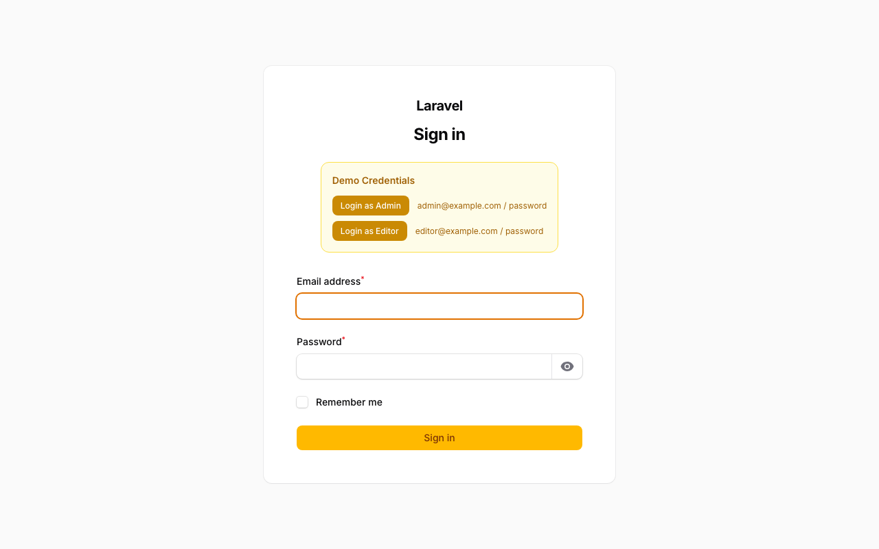 <div class="rounded-lg bg-warning-50 p-4 text-sm dark:bg-warning-950"> <p class="font-semibold text-warning-700 dark:text-warning-400">Demo Credentials</p> <div class="mt-3 space-y-2"> <div class="flex items-center gap-3"> <button type="button" class="rounded-lg bg-warning-600 px-3 py-1.5 text-xs font-medium text-white hover:bg-warning-500" > Login as Admin </button> <span class="text-xs text-warning-700 dark:text-warning-300"> [email protected] / password </span> </div> <div class="flex items-center gap-3"> <button type="button" class="rounded-lg bg-warning-600 px-3 py-1.5 text-xs font-medium text-white hover:bg-warning-500" > Login as Editor </button> <span class="text-xs text-warning-700 dark:text-warning-300"> [email protected] / password </span> </div> </div></div>