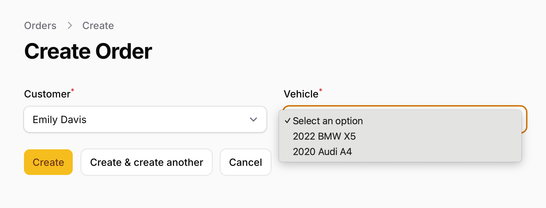 This doesn't filter vehicles by customer at all. Every vehicle shows up regardless of who's selected. That means users can pick invalid combinations, and you're relying on backend validation to catch it.