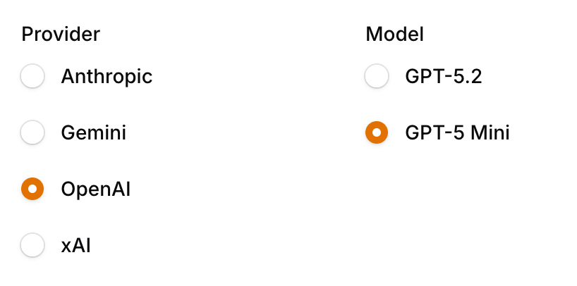 Grid::make() ->schema([ Radio::make('ai_provider') ->label('Provider') ->options([ 'anthropic' => 'Anthropic', 'gemini' => 'Gemini', 'openai' => 'OpenAI', 'xai' => 'xAI', ]) ->default('openai') ->live(), Radio::make('ai_model') ->label('Model') ->options(fn (Get $get): array => match ($get('ai_provider') ?? 'openai') { 'openai' => ['gpt-5.2' => 'GPT-5.2', 'gpt-5-mini' => 'GPT-5 Mini'], 'anthropic' => ['claude-opus-4-6' => 'Claude Opus 4.6', 'claude-sonnet-4-6' => 'Claude Sonnet 4.6', 'claude-haiku-4-5-20251001' => 'Claude Haiku 4.5'], 'gemini' => ['gemini-3.1-pro-preview' => 'Gemini 3.1 Pro', 'gemini-3-pro-preview' => 'Gemini 3 Pro', 'gemini-3-flash-preview' => 'Gemini 3 Flash'], 'xai' => ['grok-4-1-fast-reasoning' => 'Grok 4.1 Fast'], default => [], }) ->default('gpt-5-mini'),